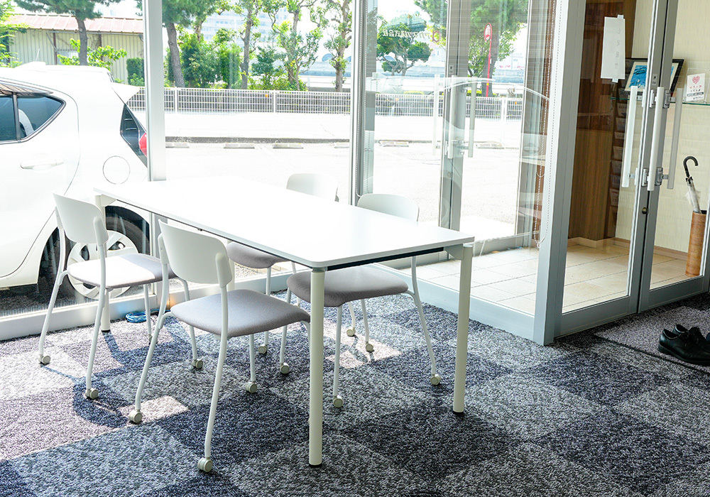 机の天板に木目調を取り入れた、シンプルかつ落ち着いた雰囲気のオフィス